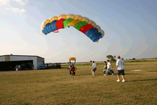 What the heck here are some pictures of her leaving the plane on a static line. I love the last one where the static line releasing, Theresa, the runway and the hanger are all in the same shot. |